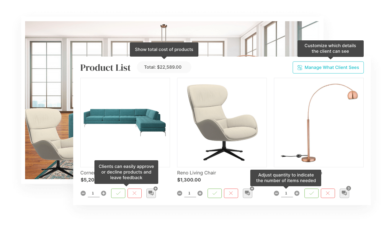 It's so easy to clip products, create design boards, and share them with clients. DesignFiles keeps conversations organized, makes it easy to filter what information clients can see, and delivers a professional, easy-to-use shopping list.